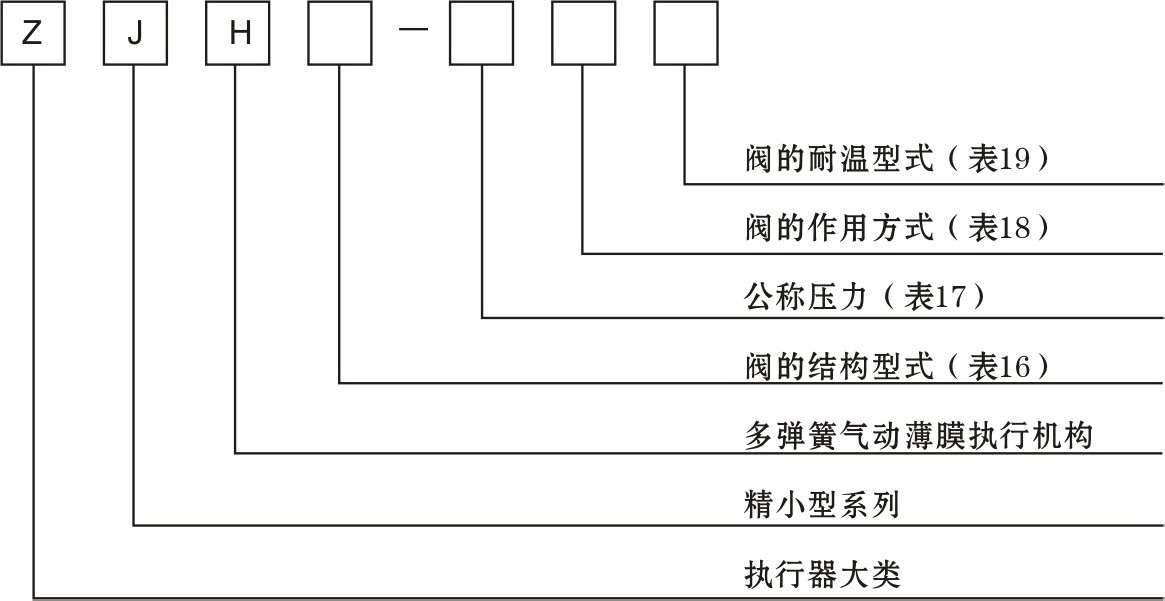 本產(chǎn)品型號由兩小節(jié)組成,節(jié)包括四位代號,表示本產(chǎn)品大類及組成的執(zhí)行機構和閥的